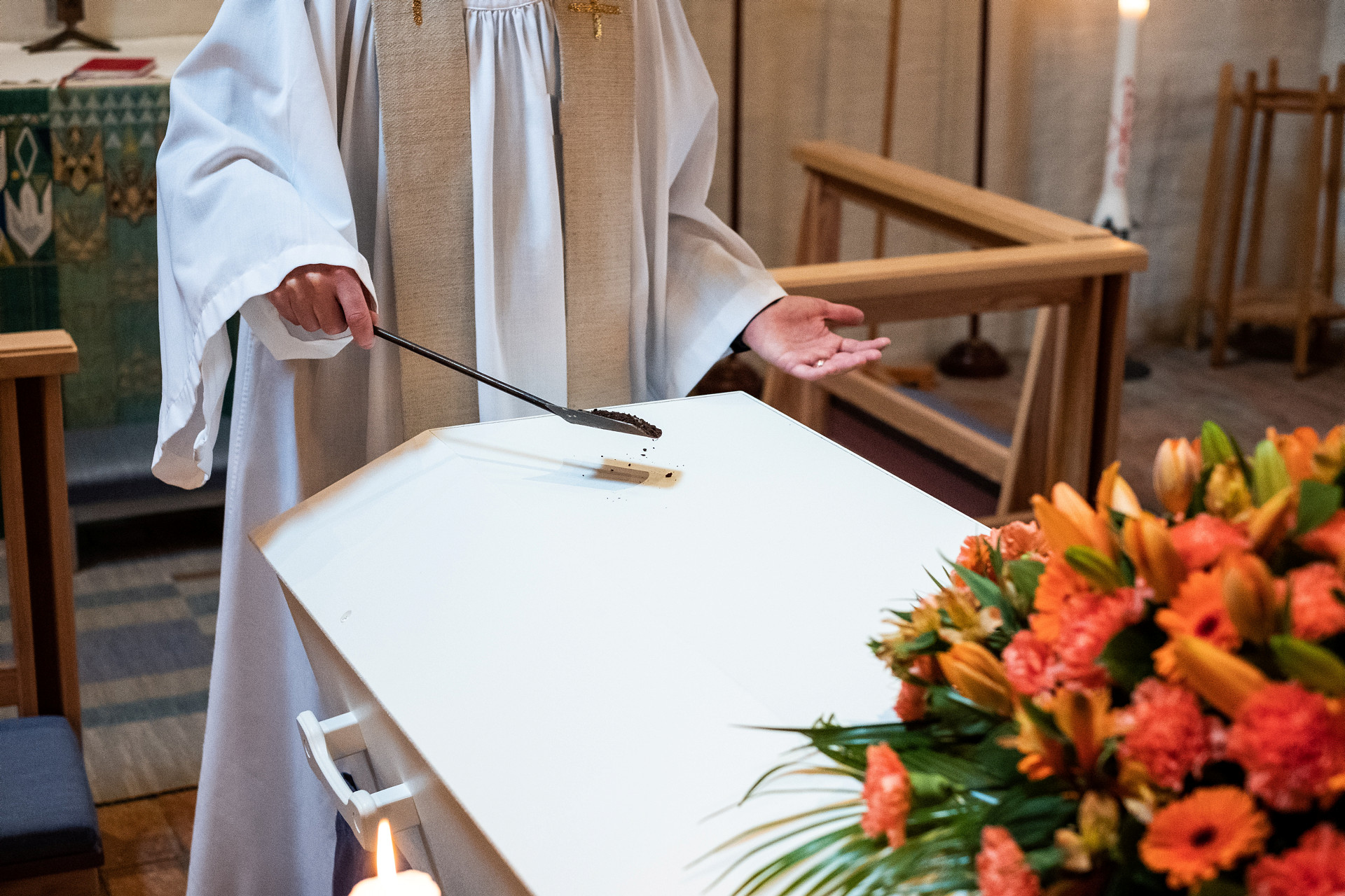 Prästen tecknar korstecknet över kistan eller låter mull tre gånger falla på kistan.