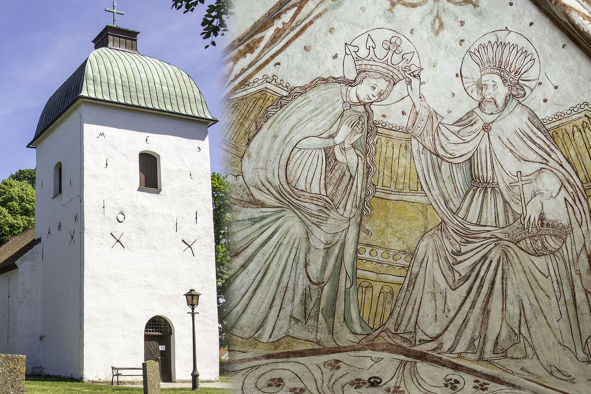 The mural paintings of the church from the Middle-Age are very notable. In different layers they have covered the interior of the church and they have been of great artistic value. They were reconstructed during the years 1945-1947. The earliest picture, on the north-side of the choir, represents St. Martin, with his sword sharing his mantle with a poor man. It is a painting from the later part of the twelfth century. Other paintings were found in the attic of the church at a restoration in the year 1975. They derived from the time before the vaults were constructed. Many paintings originate from the fourteenth and the fifteenth century, among the Saints images. From the later century there is a painting in the church porch of the Virgin Mary and St. John by the cross of Jesus. In the nave of the church you can see a painting of the coronation of the Virgin Mary with some of the apostles surrounding her. On the north wall of the choir you find the best known of these paintings, either representing the holy Kings visiting the little child Jesus and his mother, or a queen together with the family at Ellinge.