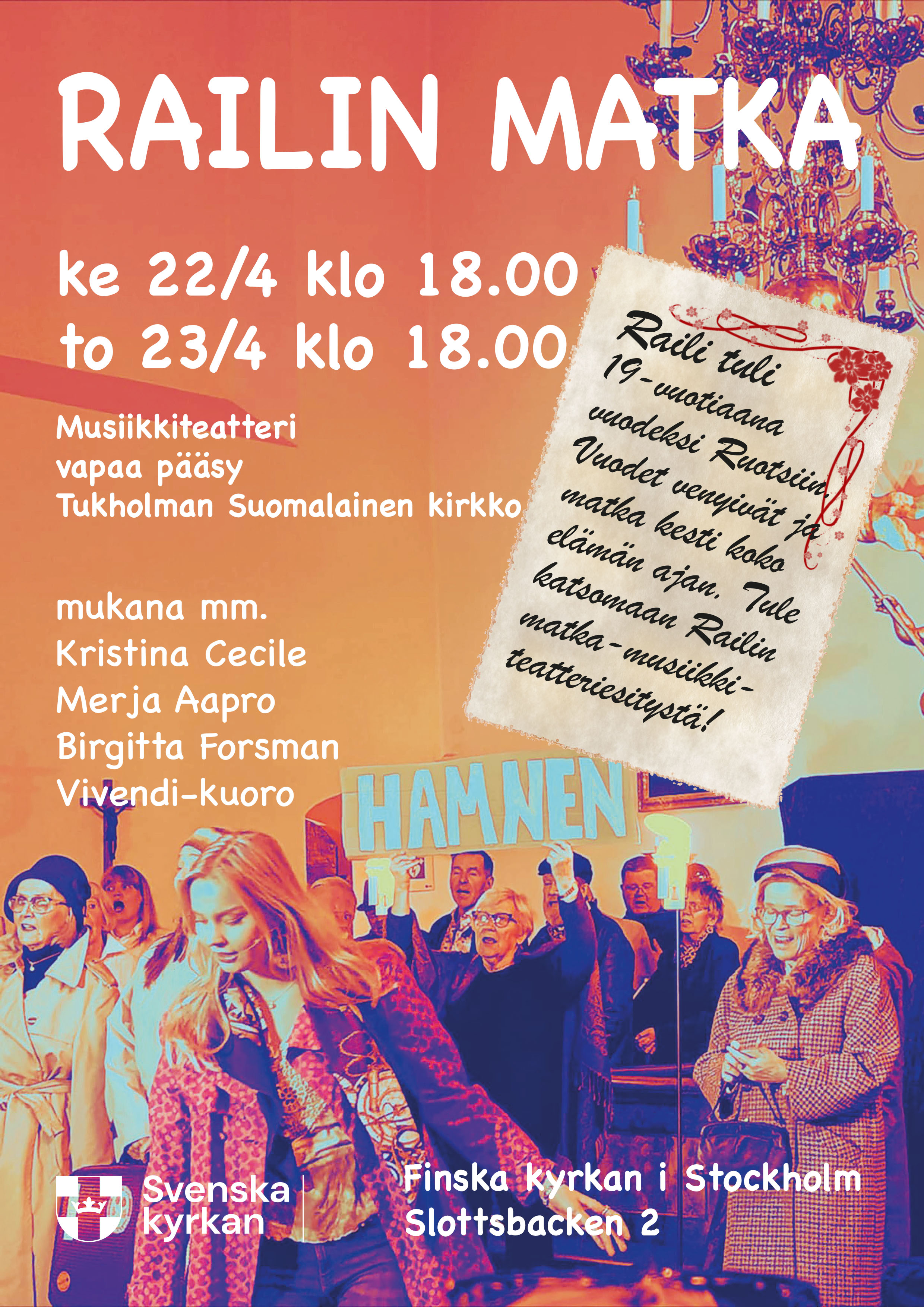Näytelmä on koottu erilaisista elämäntarinoista jota useimmat ruotsinruomalaiset tunnistavat. Elämä on 1970-luvusta muuttunut sekä Ruotsissa että Suomessa. Suomalaisten asema Ruotsissa on erilainen tänään kuin silloin. Onko kotimaa Suomi tai Ruotsi tai molemmat, olenko ruotsinsuomalainen, ruotsalainen tai Ruotsissa asuva suomalainen? Eikä elämä ole oikeudenmukainen, elämä antaa ja ottaa. Tässä tarinassa on usko Jumalaan taustana Railin suomalaisesta kodista ja se on hänen lähtökohtansa miten hän käsittelee elämäänsä. Monet erkanevat lapsuuskodin uskosta ja arvoista, ja sitten ehkä vasta kun itse saa lapsia tai vanhempana löytää takaisin Jumalan turvaan.