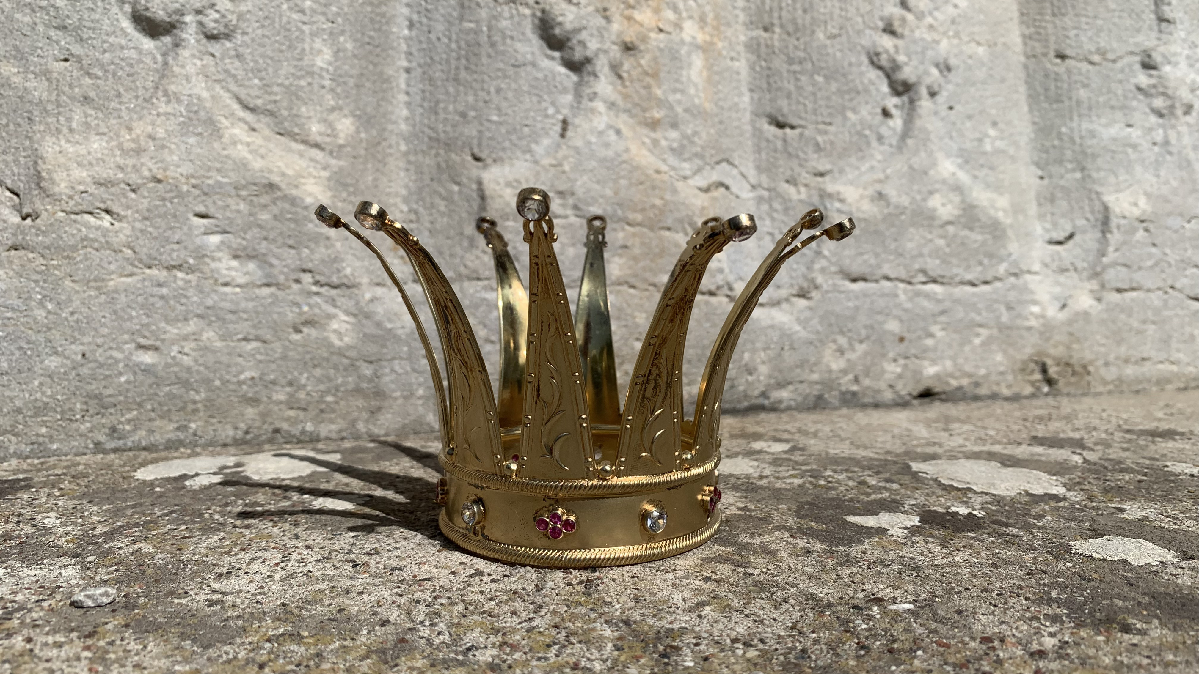 Brudkrona av förgyllt silver med etui. Slät basring med infattade stenar av glas i vitt och rosa, repstav upp- och nedtill. Tio utåtböjda uddar med bladslinga och pärlstav i relief, avslutas upptill med infattad vit sten. En hårnål, 8 cm. Tillhörande etui av trä, grönt, kubformat, ett knäpplås. Invändigt klädd i blå sammet, locket klätt i vitt.