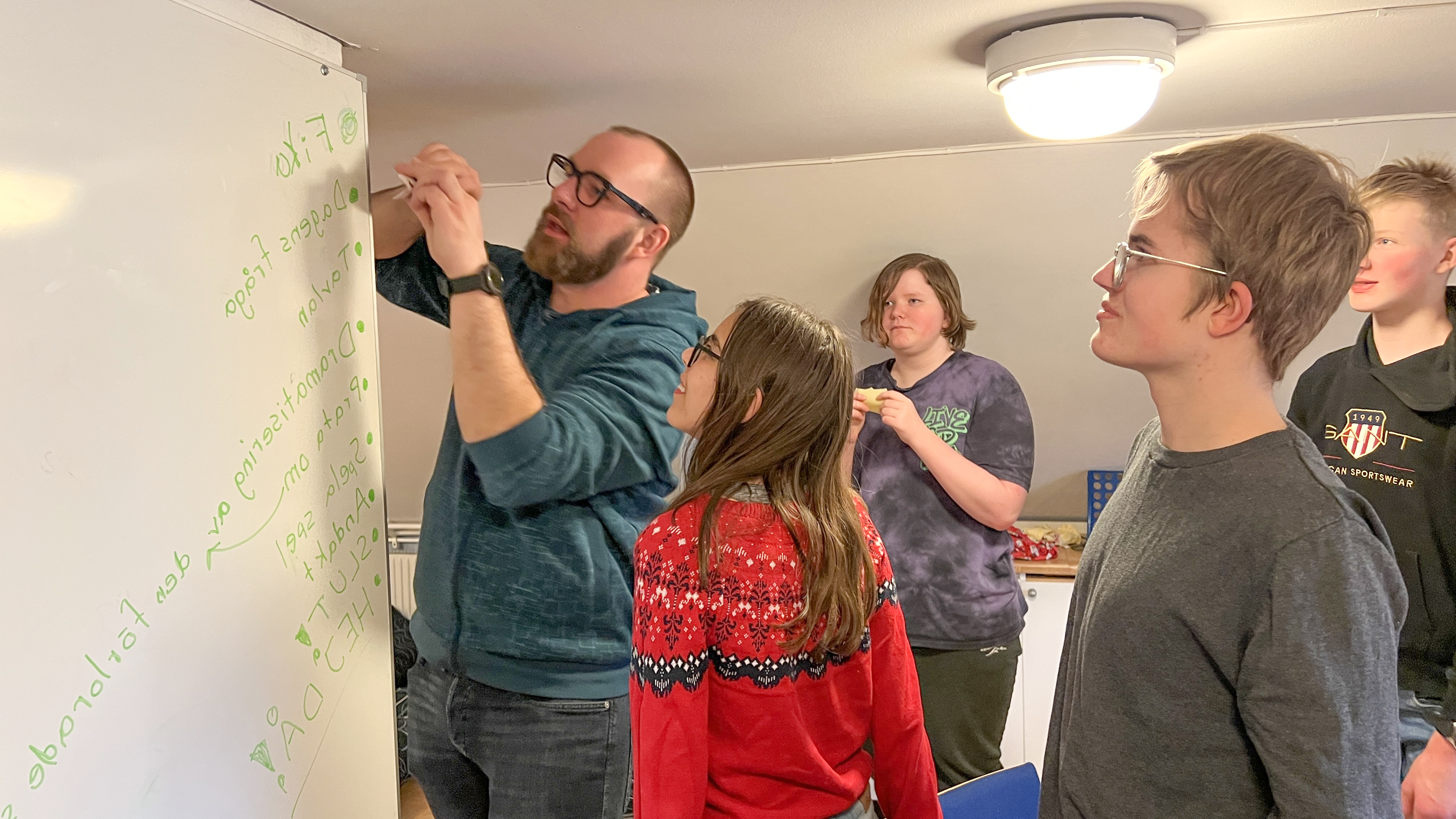 Varje träff börjar med ”tavlan”. Där skriver Adam upp allt som man ska göra under träffen. Den är till för att man ska känna sig trygg. Alla börjar fnissa när tavlan förs på tal. Det har blivit en grej att utmana Adam att skriva upp programmet på olika konstiga sätt. Det har bland annat skrivits på tyska och i formen av en kanelbulle.