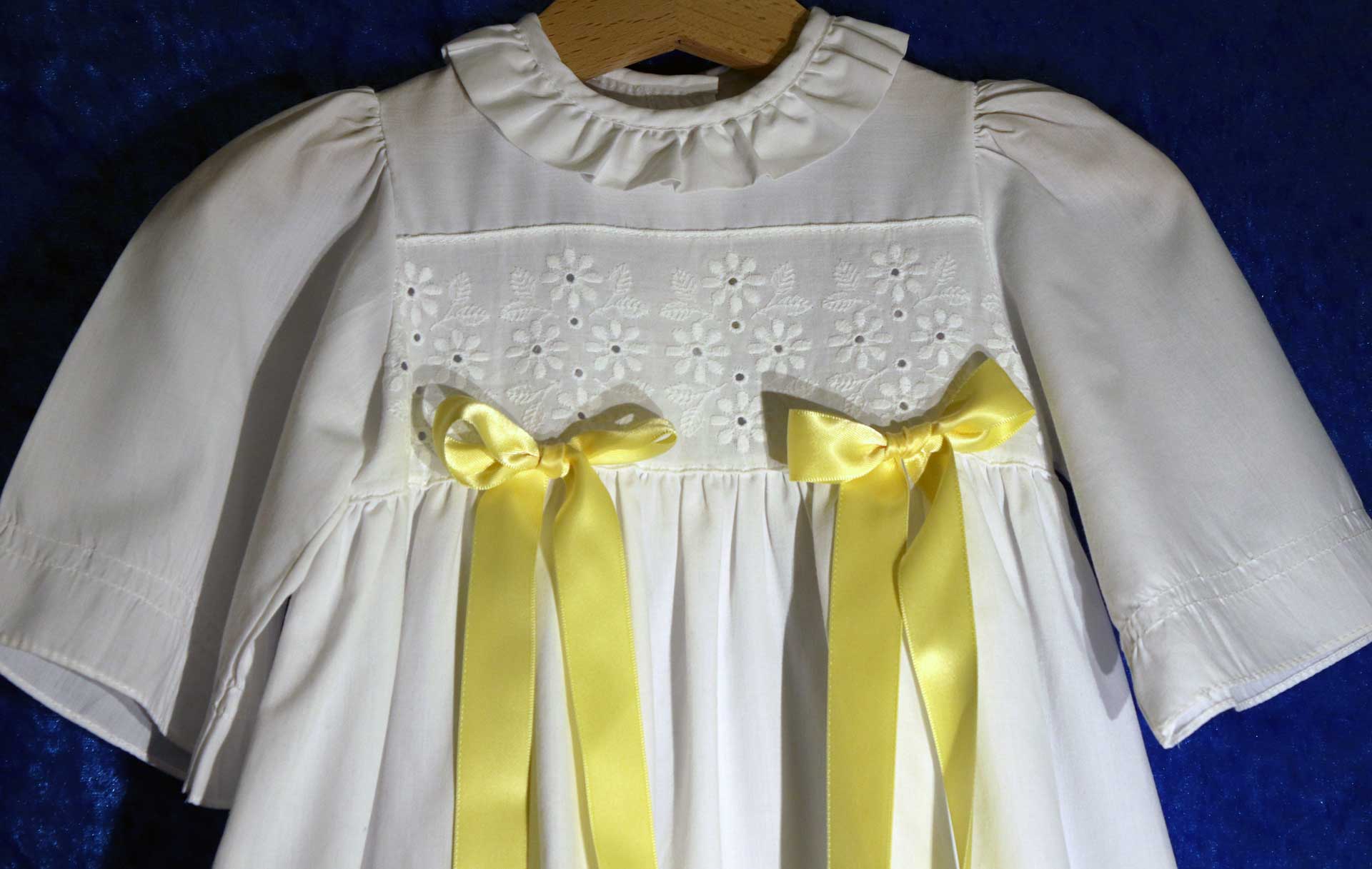 Här kommer lite bilder på dopklänningarna som finns till utlåning i Mikaels församling. Dopklänningen bokas samtidigt som du bokar dopet. Läs mer på vår dopsida. Vill du titta mer på dopklänningarna är du välkommen till expeditionen i Mikaels församling, Hjärstavägen 33, Örebro. Ring gärna innan så att du vet att det finns någon som kan hjälpa till att visa dopklänningarna. Telnr se nedan.