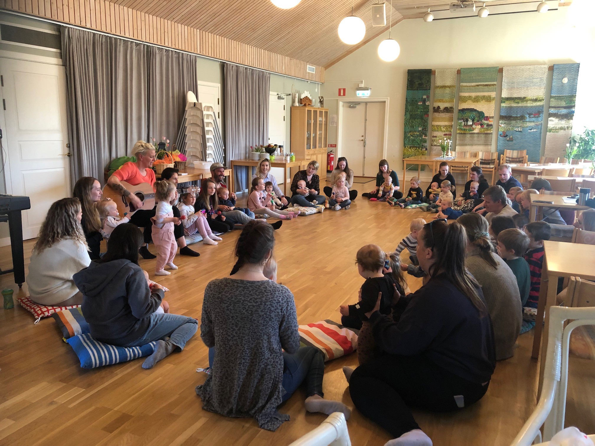 Varmt välkommen till en stunds gemenskap mellan stora och små! Lek, pyssel, sång/rytmikstund och fika. Vi bjuder på kaffe/te/saft. Enkelt mackfika finns att köpa för 20:-/familj. Det finns också möjlighet att värma medhavd mat.