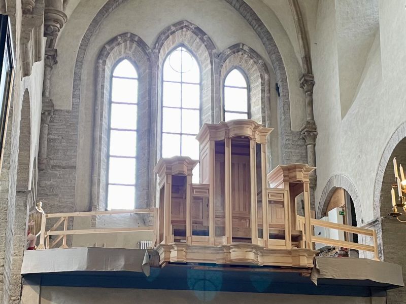 Arbetet med de la Gardieorgeln i Varnhems klosterkyrka fortskrider ungefär som planerat. Nu handlar det om att passa in sommarens arbete, semestertider och övriga aktiviteter i kyrkan med varandra. Om ett år bör vi kunna se och lyssna till en ny orgel. Orgelns lilla skåp, det så kallade Ryggpositivet står på plats. Paradoxalt nog innehåller det fler stämmor än huvudverkets stora skåp. I huvudverket är dock piporna större. Huvudverket, som förstås ska stå bakom ryggpositivet, kom på plats under våren och ska sedan målas.