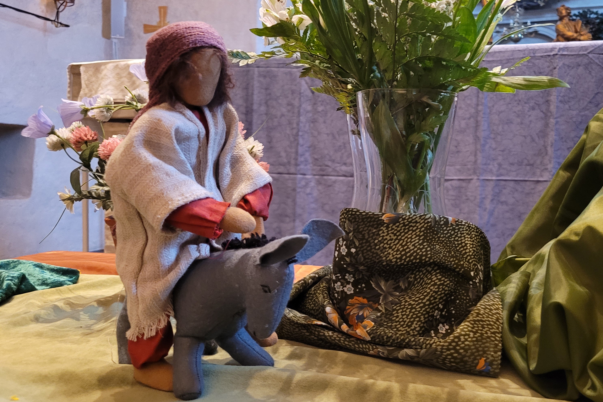 Vi berättar med dockor, sång och musik om den modig lilla åsnan som Jesus red på. De möttes av glada människor som ville att Jesus skulle bli deras kung. Berättelsen rör vid både glädje och sorg med fokus på att Jesus blev levande igen och på glädjen i allt det nya som vaknar till liv om våren. Vi använder dockor i ett uppbyggt landskap och sjunger många fina sånger.
