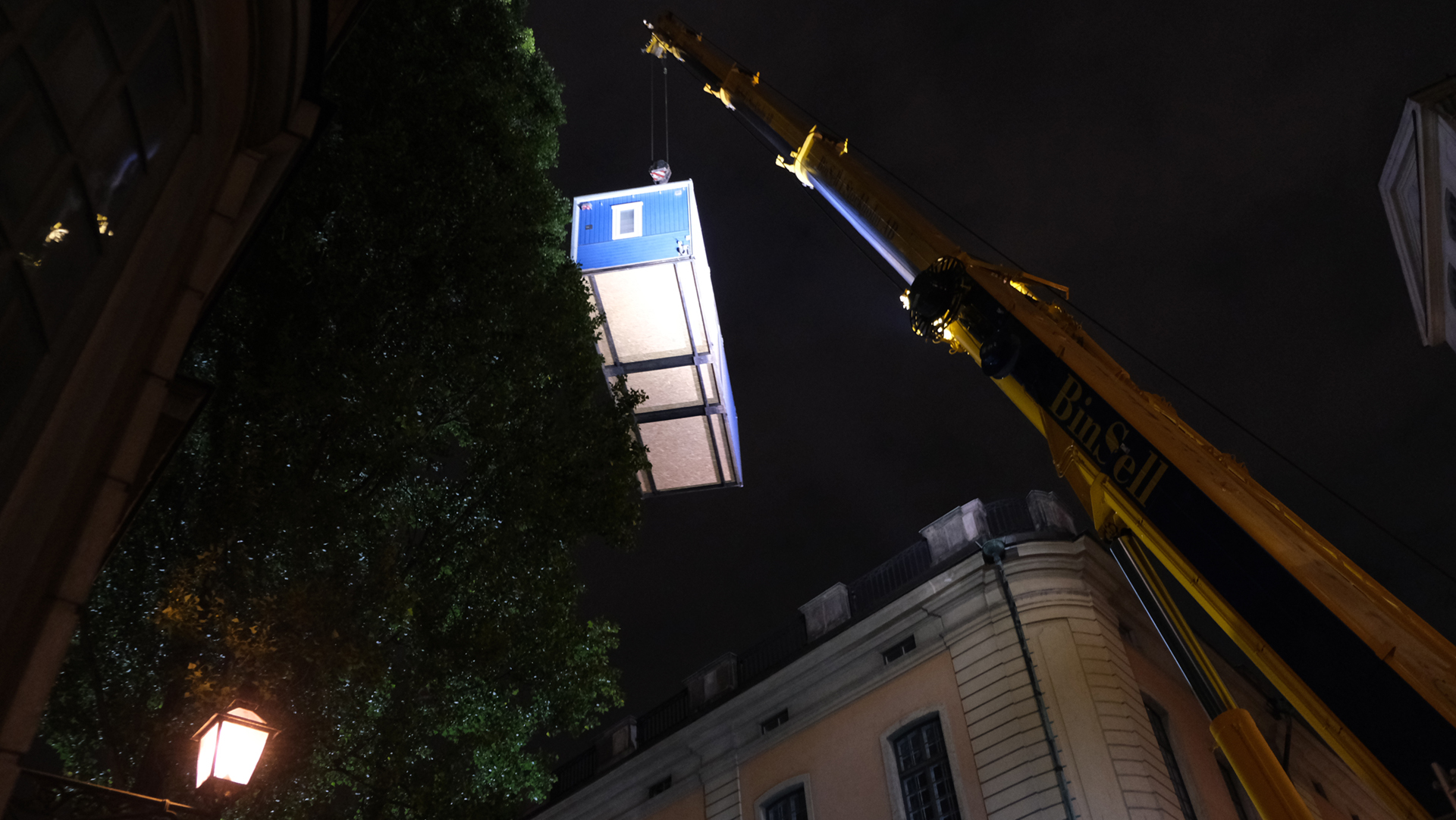 Vid 21-tiden startade det. Tre kranbilar stod radade efter varandra på Trångsund utanför Storkyrkan. Den mellersta kranbilen, som skulle lyfta över arbetsbodarna, väger 700 ton. Stödbensskydd av trä och stål lastades av och lades på kullerstenarna.