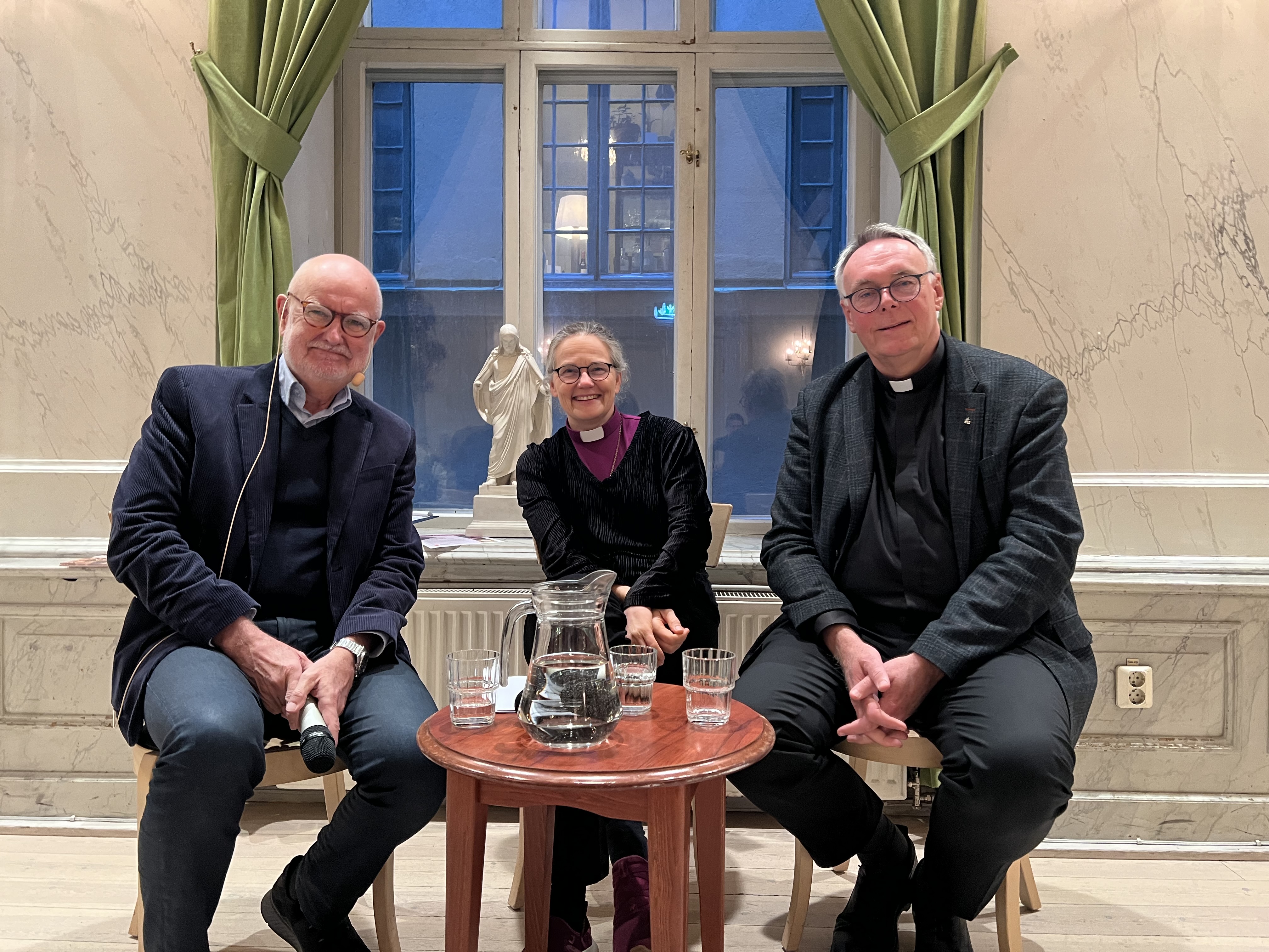 Frågeställningarna belystes av biskop Karin Johannesson, Uppsala stift och Philip Geister, SJ, rektorn för det katolska Newmaninstitutet i Uppsala, TD. Samtalet leds av Eskil Franck, docent