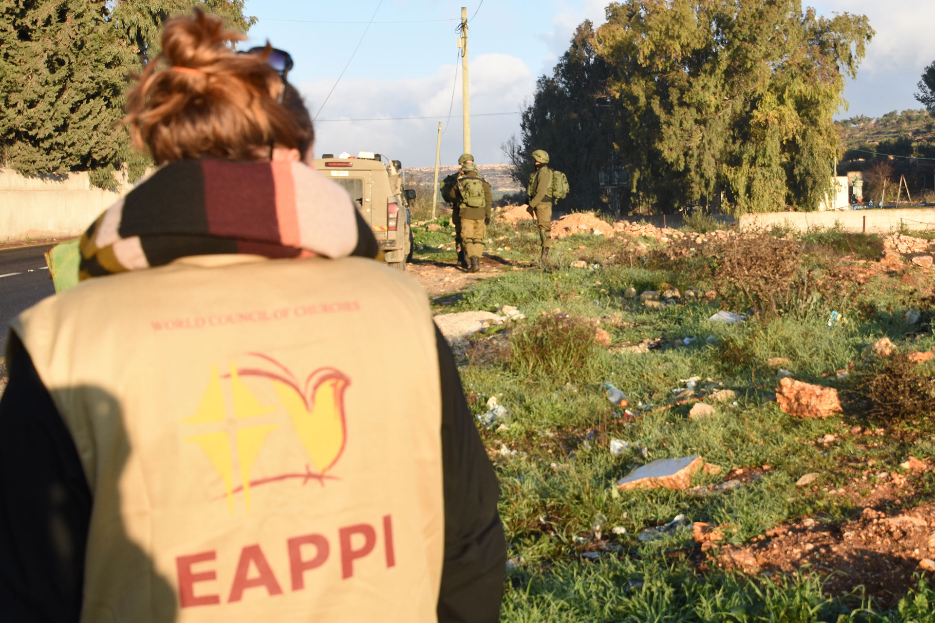 Genom Ekumeniska följeslagarprogrammet kommer människor från olika delar av världen till Palestina och Israel för att stödja dem som arbetar för en rättvis fred. Syftet med närvaron är att dämpa våld, att främja respekten för folkrätten samt att genom praktisk solidaritet stödja utsatta grupper – såväl palestinier som israeler. Ett par morgnar i veckan har Elin stått vid en checkpoint på Västbanken eller utanför skolor med hög militär närvaro. En annan del i arbetet har varit att besöka byar och familjer i utsatta områden samt följa upp incidenter. Ett exempel är barnarresteringar, där Elin och hennes kollegor erbjudit stöd i att ta fram rapportunderlag och förmedla kontakter kring var personer kan få psykosocialt och juridiskt stöd. Arbetet är inte alltid populärt och det har hänt att följeslagarna i hennes grupp har eskorterats bort av militär.