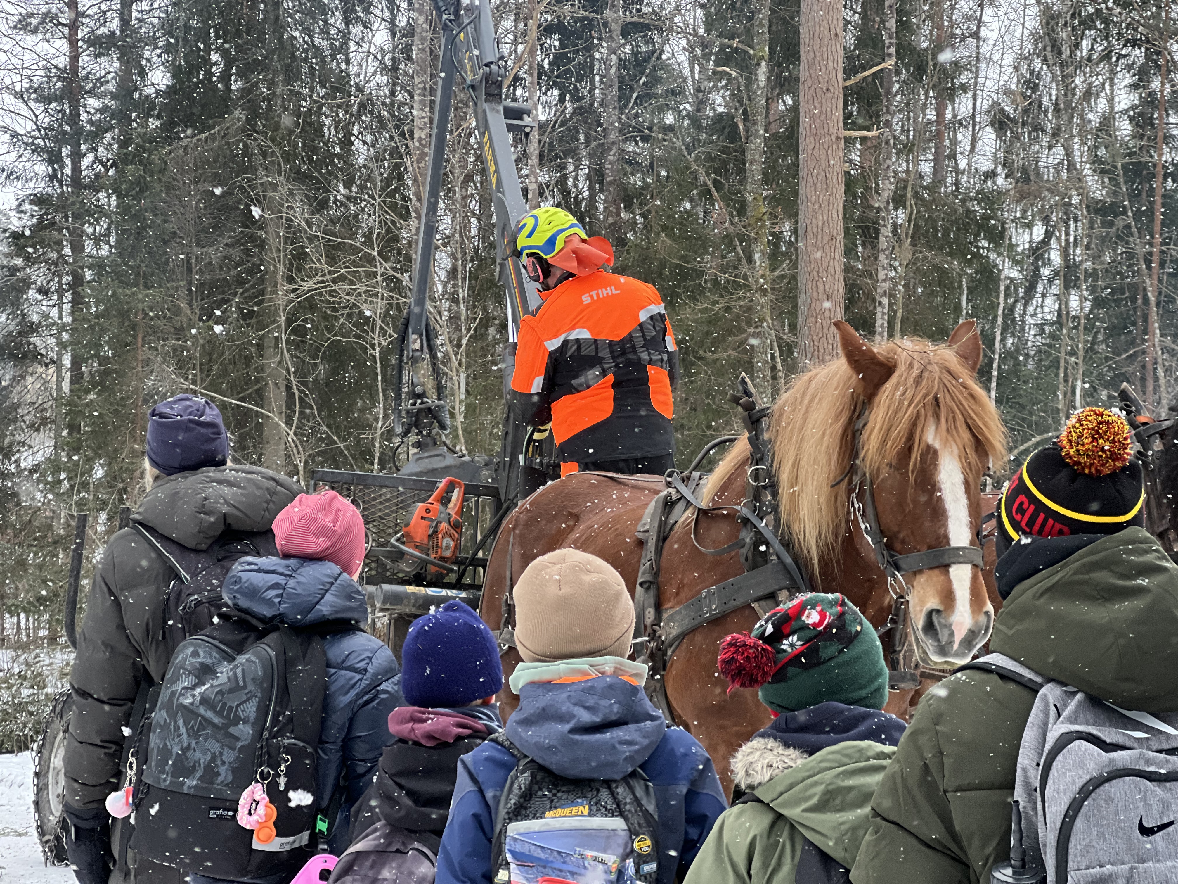 I centrum fanns arbetshästarna Tenor och Molle som tillsammans med två skogshuggare visade hur man forslar ut timmer från skogen, något som fortfarande görs där det är lämpligt. De väldiga hästarna lät sig tålmodigt klappas av omkring 120 uppsluppna elever. Skogshuggarna sågade trissor av trädstammen och visade eleverna hur man räknar ett träds ålder samt åskådliggjorde hur man hugger och får ett träd att falla åt det håll man vill.