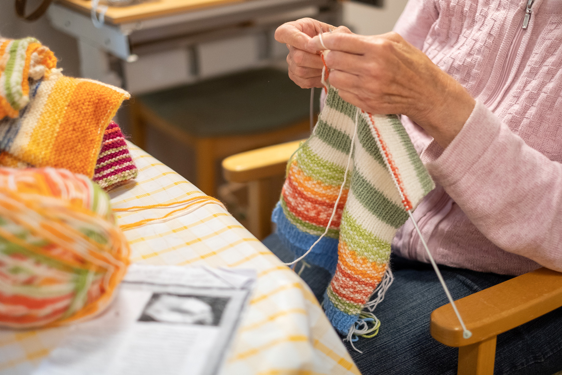 En syföreningsgrupp med kaffe, gemenskap och handarbeten.