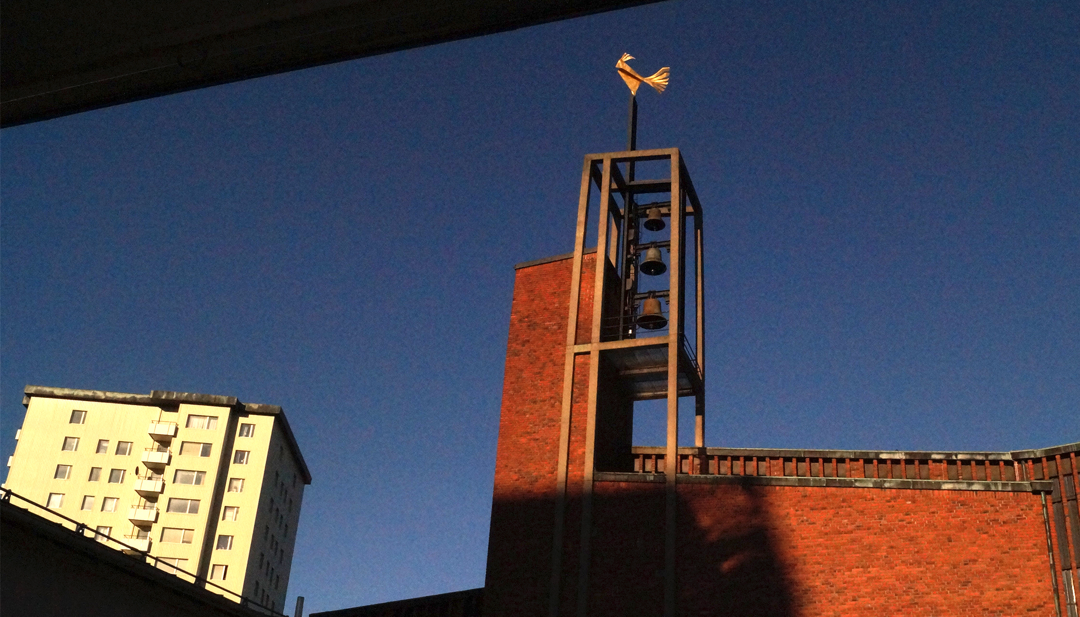Klocktornet är en öppen betongkonstruktion och har tre klockor som är gjutna hos Bergholtz i Sigtuna. Högst upp på tornet ståtar konstnären Arne Jones stolta tupp i förgylld aluminium. Tuppen valdes till ”Årets kyrktupp” i Sverige 1997.
